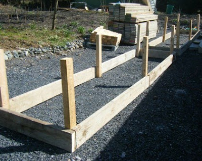 To build the beds themselves we laid scaffolding planks two long and three broad across three of the stakes -- one stake held each end, and one more held the middle. We screwed the planks into the stakes with three-inch screws, and that was one side of the garden bed. Three more planks across each end completed the bed, so heavy it took four people to lift into place. We dug the topsoil out of the space where the bed would go, placed the bed in the space, and measured every side and corner to make sure it was level – where one side was too low, we wedged rocks underneath.